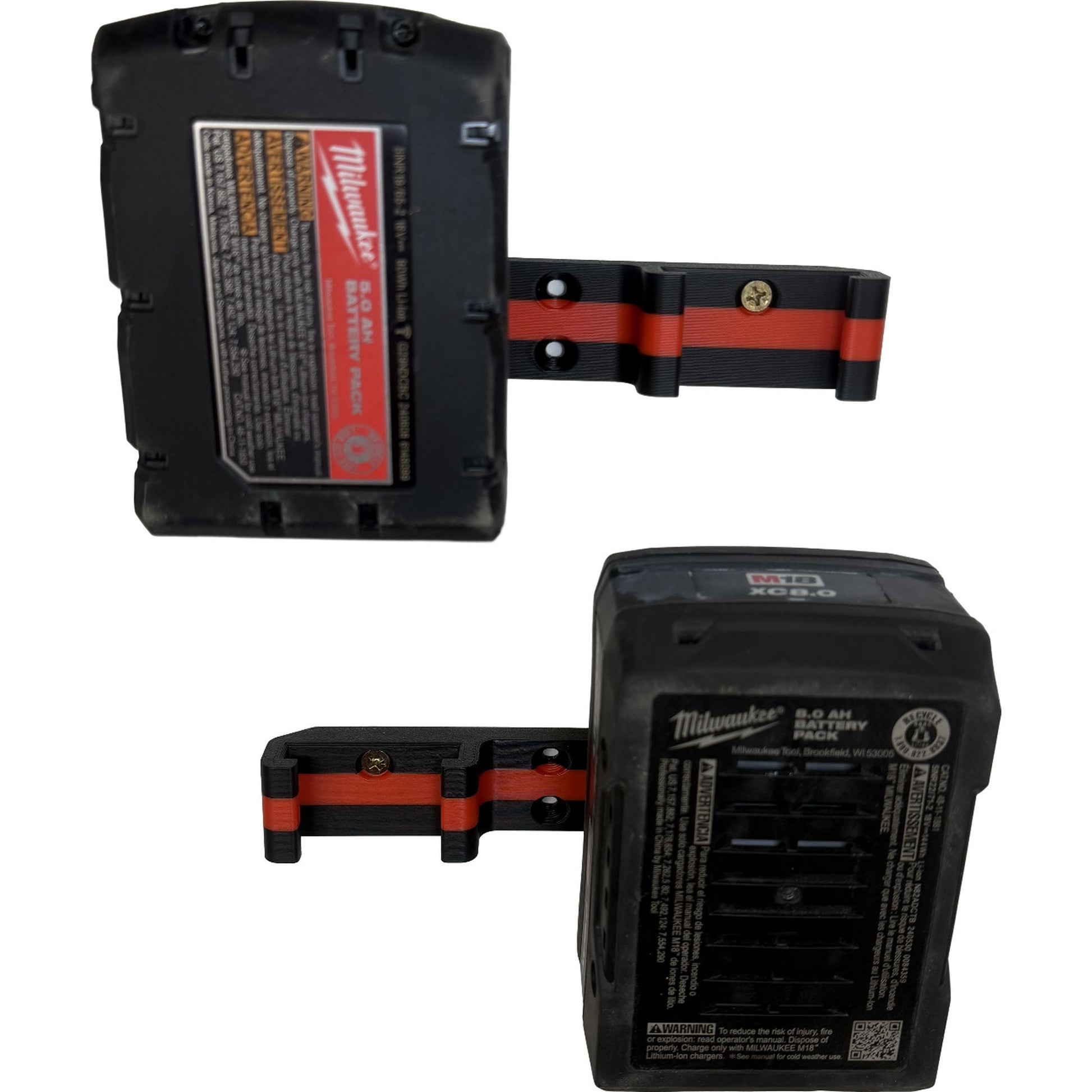 Our 3D printed mount allows you to keep your Milwaukee M18 batteries up and out of the way. We recommend installing on a backing board of plywood or other lumber, or aligned with studs, for maximum security.